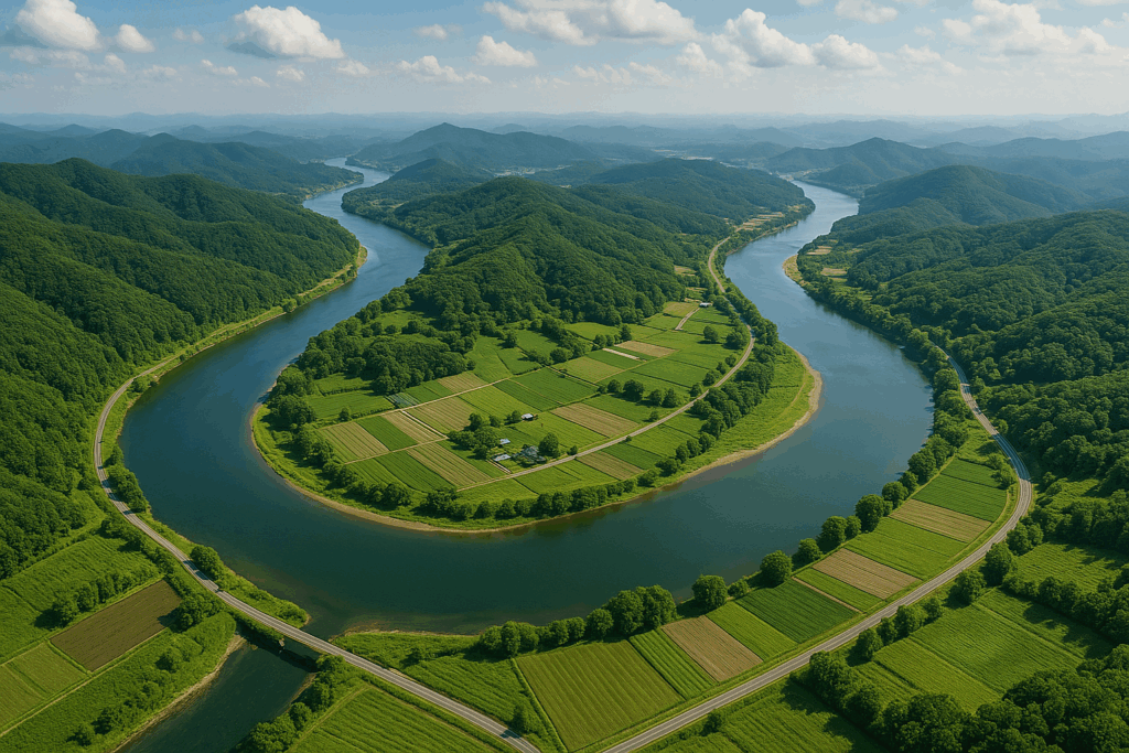 자연의 형세 속에서 흐르는 풍수지리의 리듬 — 산의 곡선, 강의 흐름, 마을의 배치가 조화를 이루며 기(氣)의 순환을 보여준다.